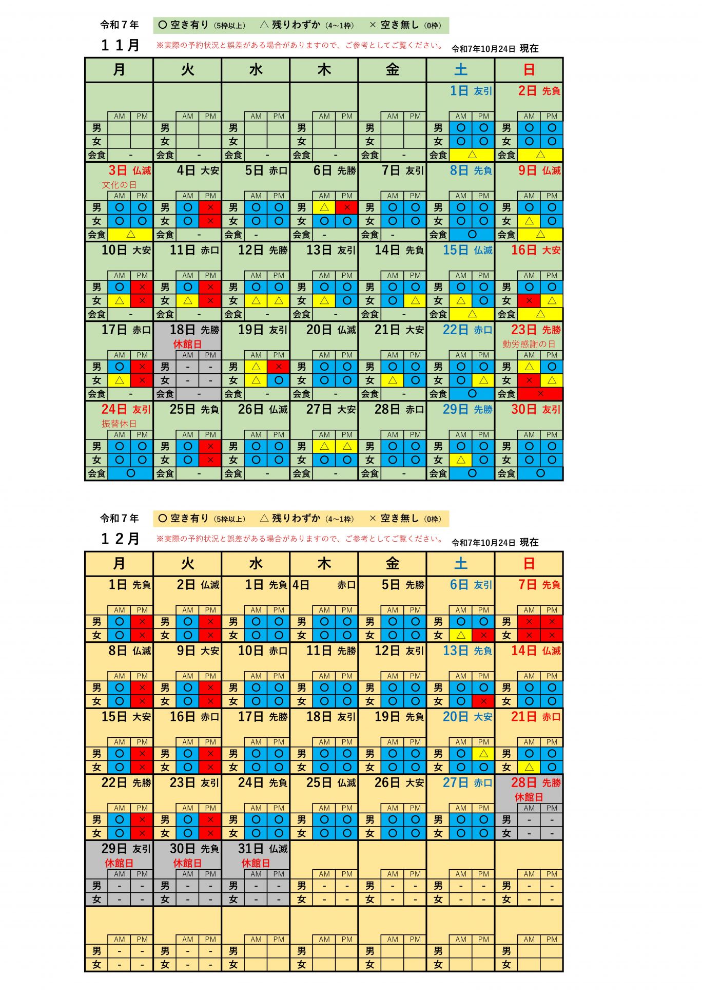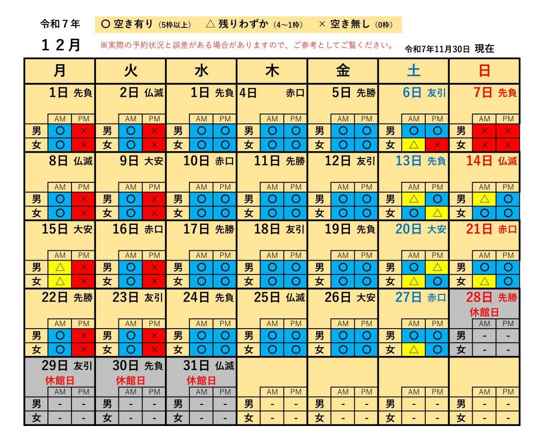 | 空き状況について | 空き状況は日々刻一刻と変化しています。下表では空いていても、お問い合わせ時には埋まってしまっている場合もありますので、下表は混雑状況のご参考としてお考えください。 |